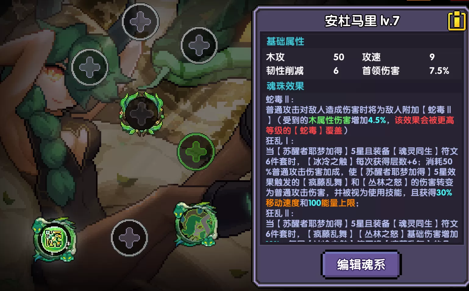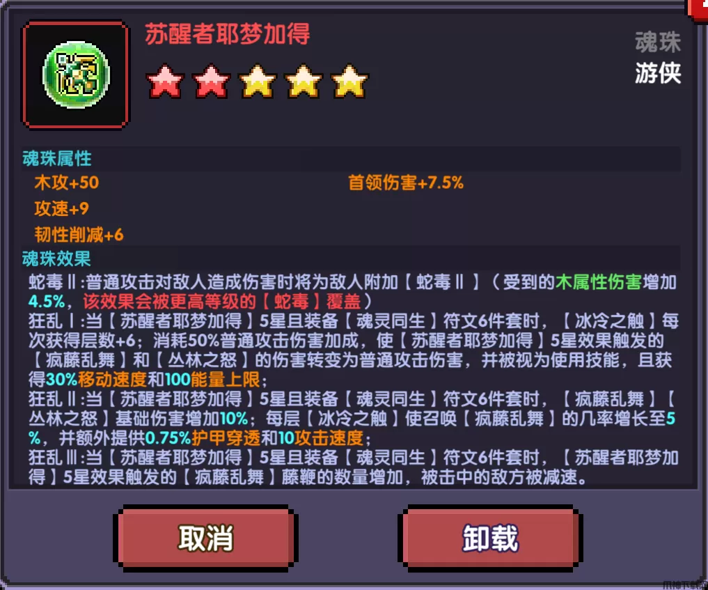 狂乱Ⅲ:当【苏醒者耶梦加得】5星且装备【魂灵同生】符文6件套时,【苏醒者耶梦加得】5星效果触发的【疯藤乱舞】藤鞭的数量增加,被击中的敌方被减速