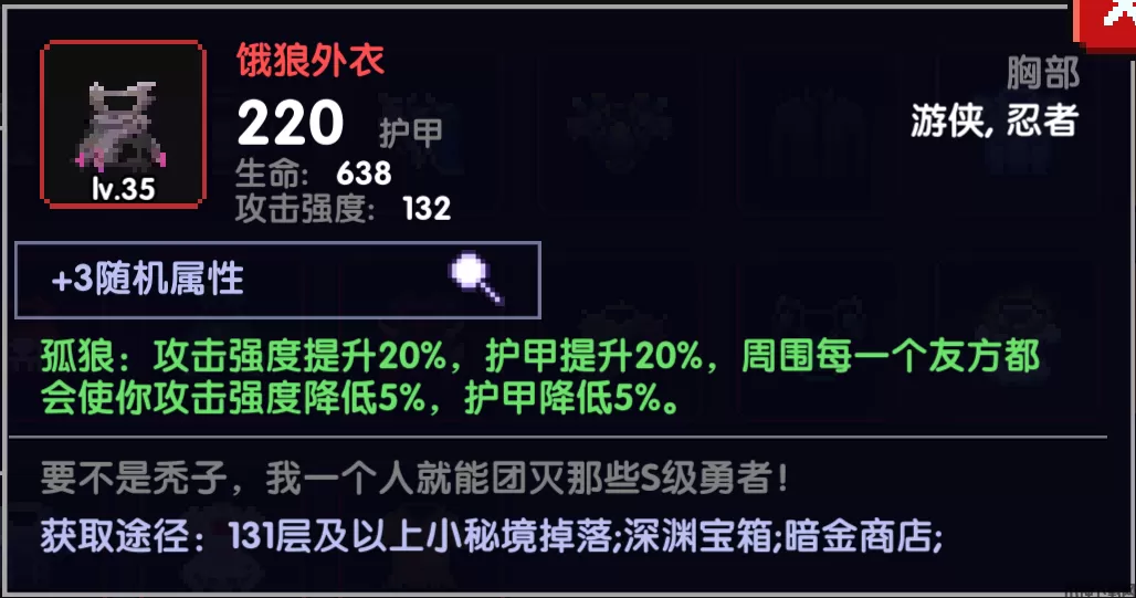 孤儿甲,游侠单人最强胸甲,单人时基于攻强白值提供20%攻强