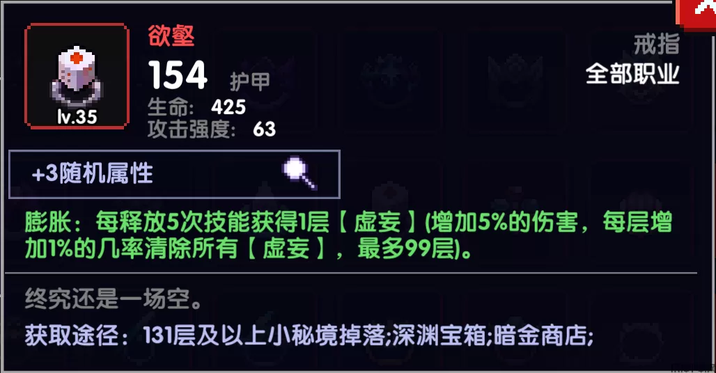 赌狗戒,释放5次技能获得一层【虚妄】,每层【虚妄】提供5%全伤加成同时增加清楚【虚妄】的概率,魂珠视为使用技能,使得疯藤技能频率极高,叠赌狗很快,首选