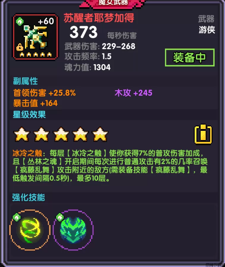 狂乱Ⅱ:当【苏醒者耶梦加得】5星且装备【魂灵同生】符文6件套时,【疯藤乱舞】【丛林之怒】基础伤害增加10%;每层【冰冷之触】使召唤【疯藤乱舞】的几率增长至5%,并额外提供0.75%护甲穿透和10攻击速度;