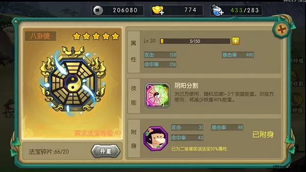 八卦镜为二娃专属法宝,可以提升自身属性外还有特殊技能增加自身能量和降低敌方能量