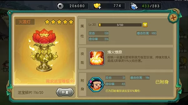 火莲灯为四娃专属法宝,可以提神自身属性外还有特殊技能队敌造成三次火焰伤害