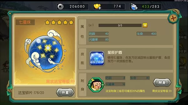 七星珠为三娃专属法宝,可以提神自身属性外还有特殊技能免疫敌方一次技能伤害