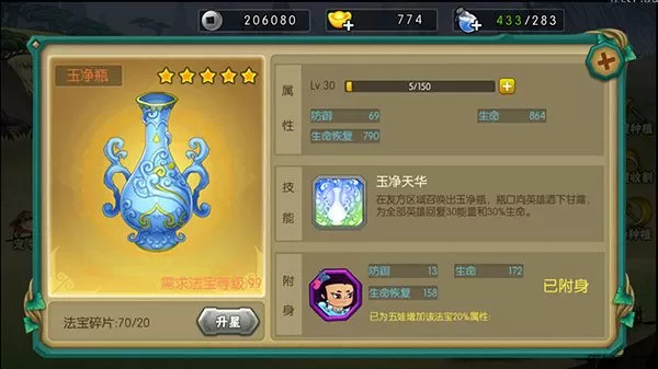 玉净瓶为五娃专属法宝,可以提神自身属性外还有特殊技能提升团队能量和回复血量