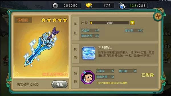 诛仙剑为六娃专属法宝,可以提神自身属性外还有特殊技能对所有敌人早晨伤害