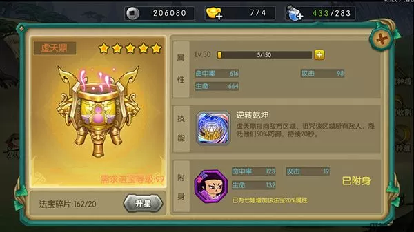 虚天鼎为七娃娃专属法宝,可以提神自身属性外还有特殊技能诅咒敌人降低50%防御