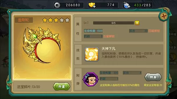 金刚轮为小金刚专属法宝,可以提神自身属性外还有特殊技能友方前排免疫伤害且增加暴击