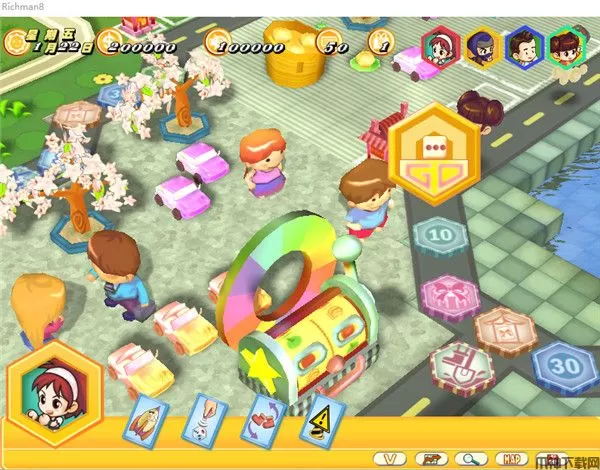 大富翁8这款游戏是由软星科技(北京)有限公司研发的一款经典策略益智类游戏,相信大家对大富翁系列肯定不陌生,北京寰宇之星软件有限公司策划的大富翁8是经典游戏大富翁系列最新作,大富翁8已经早在2006年2月就已经正式发行了。大富翁8Mac版,其实是移植版本,大富翁8依然采取轻松愉快的娱乐氛围,以欢乐和爆笑的游戏风格考验每个人智慧和运气的金融大战,游戏画面用色比起前代作品更加厚重,加上全新的粒子效果,试图给人一种迷离于童话世界的幻想感觉,小编在试玩的时候感觉非常的不错,大富翁8还有着巨大突破:例如冲出国界,带大家体验各国风土人情;还有如同皮影戏的3D纸片人物、Avatar换装系统、造型Kuso、交通工具、所有建筑的3D造型都更加光滑,更有真实感;对于很多和小编一样喜欢怀旧的朋友来说,大富翁8是一种很好的向过去回味,还有更新进化,不断升级的卡片道具和各路神仙,还有非常多的游戏角色,小编初选游戏人物时还是比较头大的,毕竟那么多的人物选择,每一个的能力又各不一样。所以,小编是推荐大家第一次玩的时候选择随意一些,后续再体验更多的角色,在卡片部份这次有高达49种不同的卡片可使用,大大的增加游戏的乐趣。小子简单说明下,特定的人物在特定的地图才会有放大镜忍太郎:东京 (监狱后面) 钱夫人:香港、阿拉伯(麦加后面)、拉斯维加斯(费蒙街旁边的魔法屋子后面) 乌咪:澳大利亚(凯恩斯后方)、上海、好莱坞(西比弗利大道后方) 阿土仔:台北(乌来旁边)、夏威夷(医院后面)、索伏特斯达游乐场(监狱旁边)、巴黎(凯旋门旁边)。