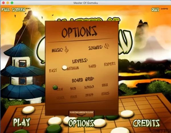 2、点击options,可以设置游戏声音、电脑ai等级和棋盘大小;