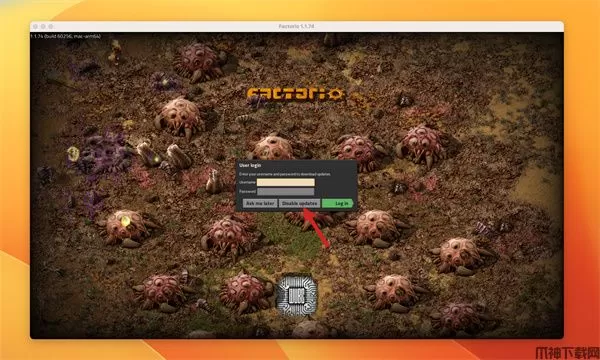 1、打开异星工厂游戏,首先选择【disable update】禁止更新!!