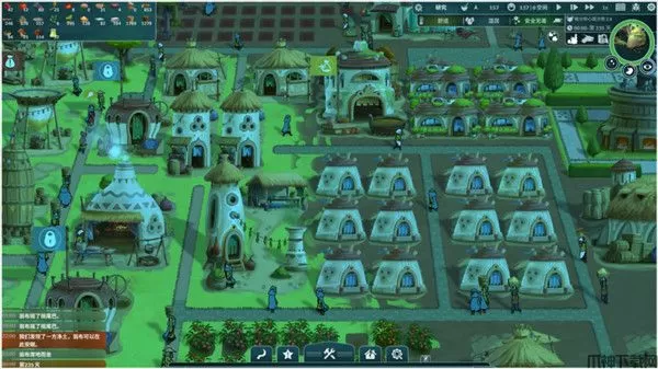 工作小屋的小人可以负责专项工作,移动速度能快一点儿,杂工就跟空闲村民一样啥都干,收割工就会去收植物、砍树、挖石头等,搬运工就负责把资源送到仓库或者工地等需要资源的地方,建筑工就会先去建筑(似乎建筑工不负责搬运建材……)。