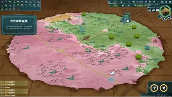 即使村民与翁布的关系良好,能够指挥翁布在路口按照玩家的意愿前行,路上的收获与灾难依旧是未知的。玩家可能在大地图上,注意到了某一方向上大量的有益事件。比如可以帮助翁布快速回复生命和精力,同时完全无毒无污染的天然翁布休眠所;又或者,一群能为你增加人口的饥渴漂泊牧民。这些收益驱使玩家选择这条道路,但当真正深入这条分支之后,等待你的可能还有一大片剧毒森林,甚至是一片接着一片的剧毒森林。
