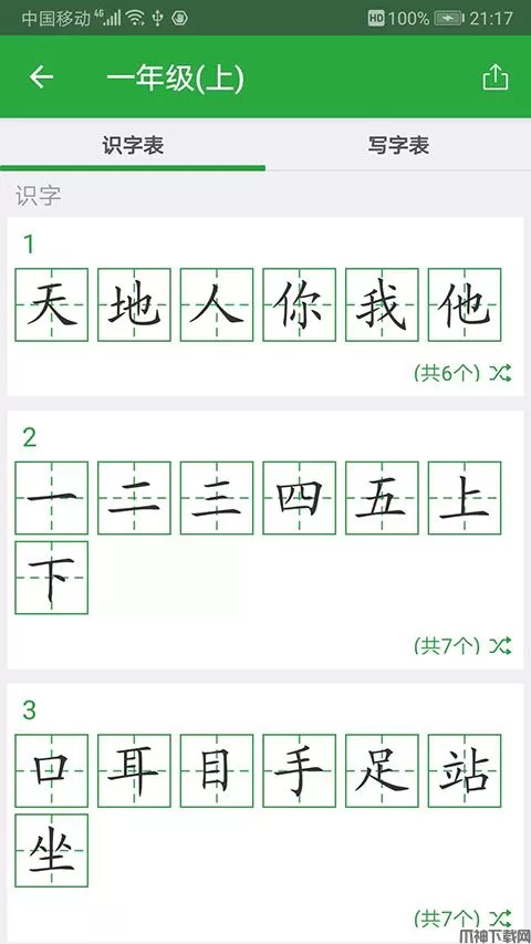 1、与小学语文教材的生字进行同步训练,让孩子通过手机也能学习。