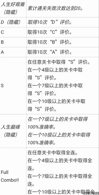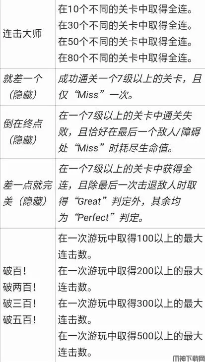 在7级以上难度关卡中获得全连,且除最后一次判定位Great外,其余全为Perfect。