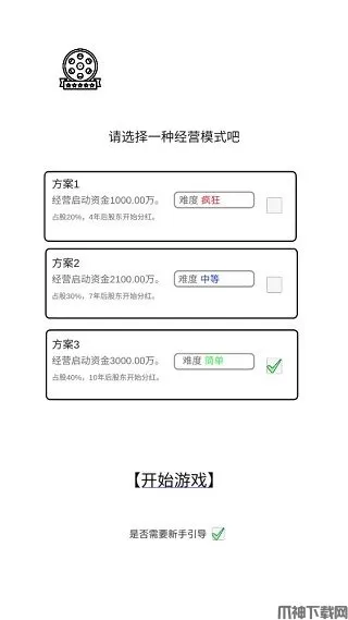 1、进入游戏,选择存档,之后选择一种经营模式,如方案1:经营启动资金1000.00万,占股20%,4年后股东开始分红;方案2:经营启动资金2100.00万,占股30%,7年后股东开始分红;方案3…,不同的选择方案对应的难度不同,如果是新人导演,建议从最简单的方案3开始做起!