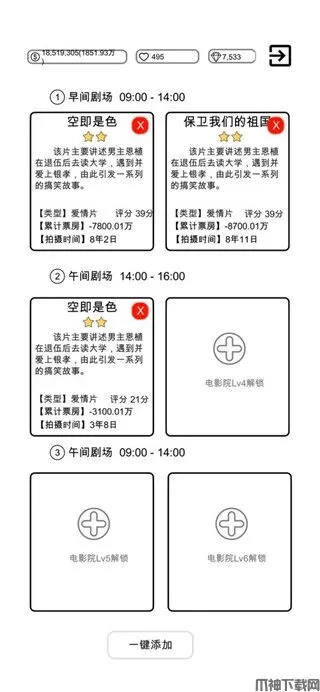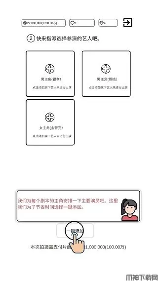 8、影片名称确定好之后,接着就是为剧本的主角分配艺人,为了节省时间,玩家可通过“一键添加”进行设置。