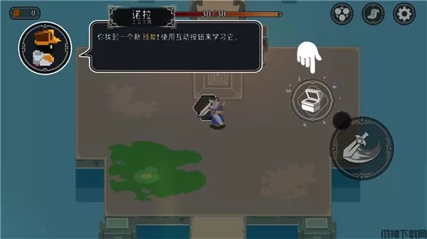 4、右边的攻击键来攻击敌人,敌人死亡后会掉落装备,点击互动键,捡起并学习装备。