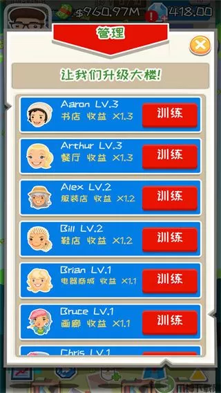 针对玩家已有的商业版块,你可以追加等级的提升,提升过后的商铺会为你带来更高的资金收益,同时雇佣新的管理员,便可免去玩家的操作,自动放置便可收获大量金钱。