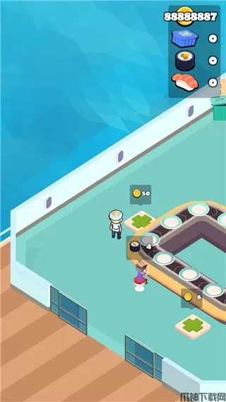 5、雇佣员工捕鱼,搭建一个小厨房,加工成寿司,搭建一个类似旋转火锅的旋转寿司输送平台。
