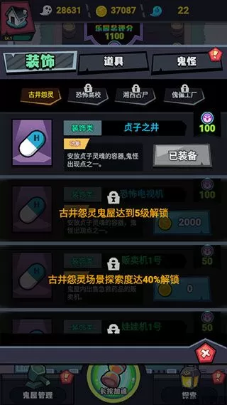4、主页左下角【鬼屋管理】可以看到各种装饰、道具,还有恐怖高校、湘西古尸以及傀儡工厂等主题等待解锁。