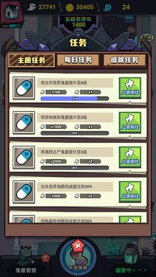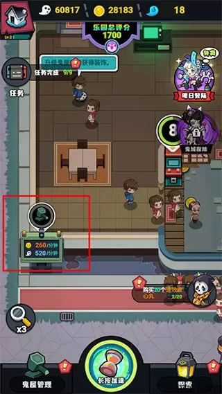 2、中心是自己管理的鬼屋,左上角是当前等级,还有自己获得的评分、金币等,右下角还有任务哦。