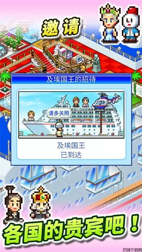 豪华大游轮物语最新版是一款模拟经营类手游,游戏继承了开罗工作室一贯的制作风格,依旧是像素风的经营游戏,本作讲述了玩家扮演一位游轮经理,通过一系列经营成为世界第一豪华游轮的故事。