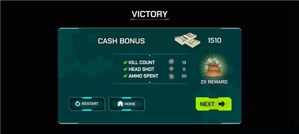 9、结束本场战斗以后,可以看到本局获得的奖励,并选择前往下一关或者回到首页,基本的玩法就是这样,喜欢的朋友快来下载外星人射手体验吧。