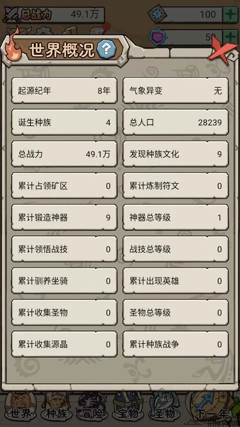 4、玩家也可点点击左下角的“世界概况”,查看整个世界的各项信息,从而更好的管理世界。