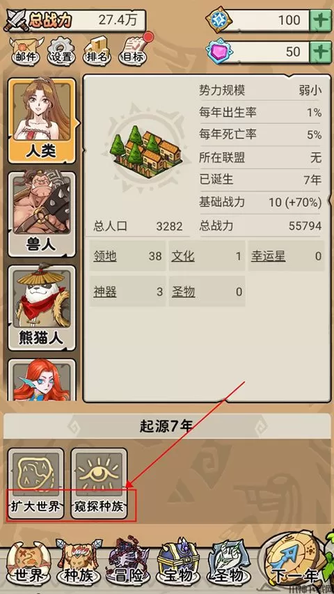 1、进入游戏后,玩家可以通过点击起源下方的随机事件,为种族提升战力、人口等。