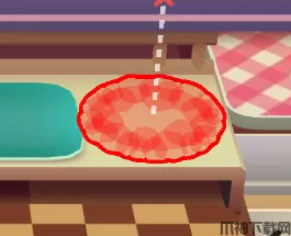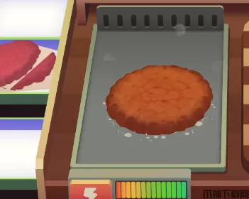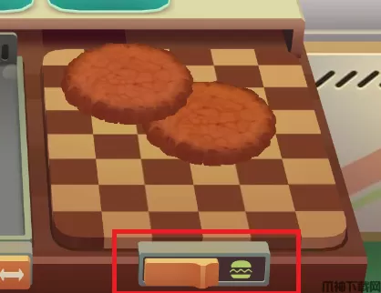 5、当肉饼煎到褐色就代表已经熟了,拖动汉堡到砧板上,点击砧板底下按钮。