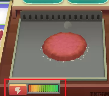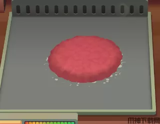 3、将肉饼放到铁板上烤熟,食材会占用对应的面积,记得好好利用空间,拖动汉堡到白色区域,白色区域为可放置区域,红色区域为不可放置的区域。