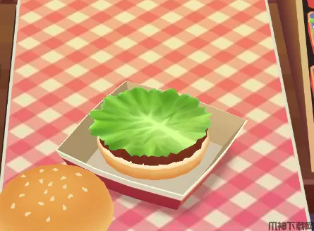 7、先将面包片放入餐盒中,将牛肉饼放到面包上,拖动生菜放到汉堡上。玩家可以随意放置肉饼和生菜的位置,点击沙拉酱在汉堡上长按滑动,美味的汉堡就做完了!成功解锁新食谱,牛肉汉堡。
