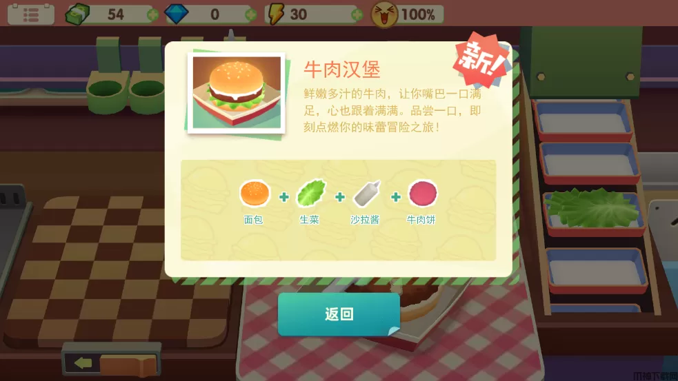 3、游戏中有多个菜谱等待玩家发掘,包括深海鳕鱼堡、厚牛培根堡、鲜虾芝士堡等,让玩家有更多的挑战和乐趣。