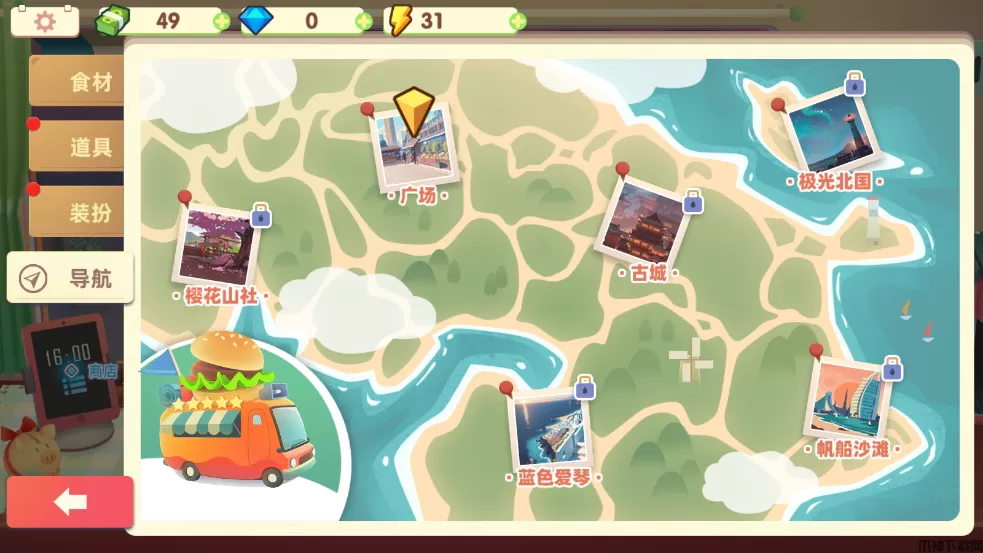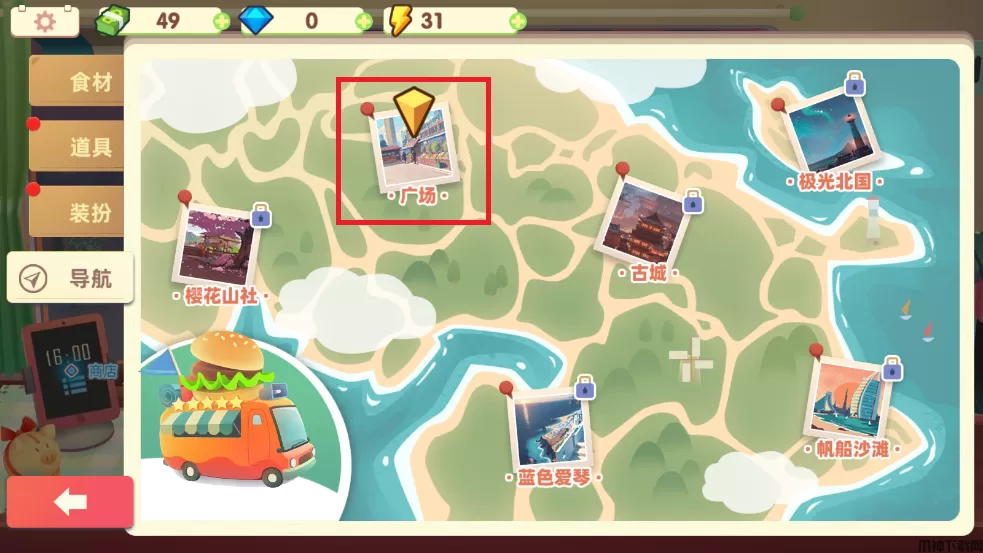 5、让餐车的足迹遍布各地,游戏中目前开放的地区有广场、樱花山社、古城和蓝色爱琴等地图。