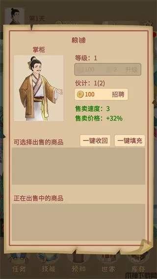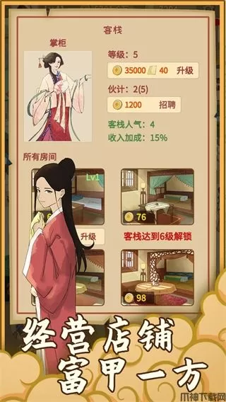 购买并经营多种店铺,店铺可升级、可招募掌柜和伙计,店铺种类包含商铺、酒肆、客栈、当铺、银号、船坞等。