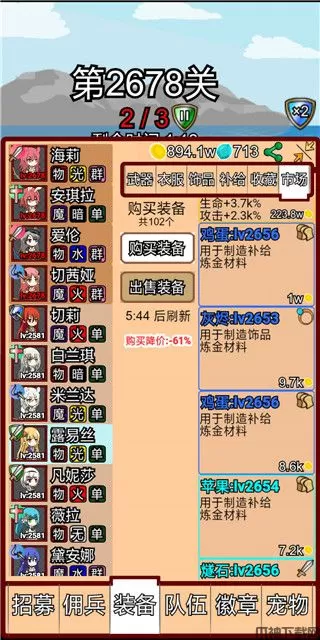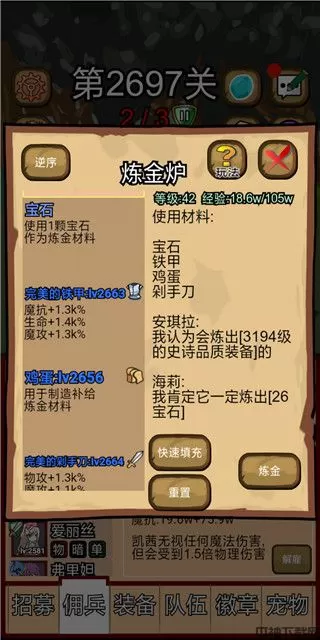 装备:基本靠炼金,最好就是刷宠物顺便刷炼金,不然层数太高装备买不起。两个同等级和两个低一等级的可以合成高一级装备,四个相同位置的装备可以合成同一种装备,不同种装备炼金出的种类随机,似乎饰品类概率最好,补给类似乎概率为零,所以补给类只能四个补给类合成