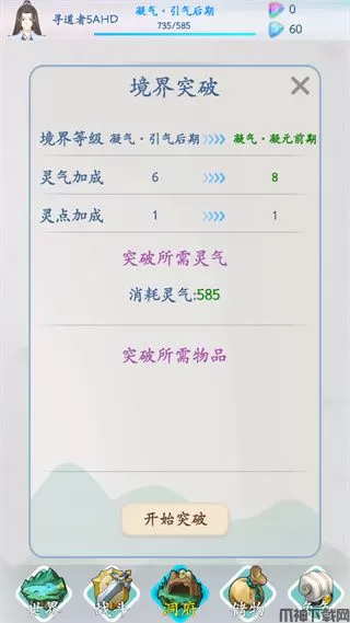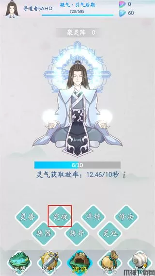 2、游戏会自动获取灵气,灵气到了一定数量,玩家可以点击突破来突破境界;