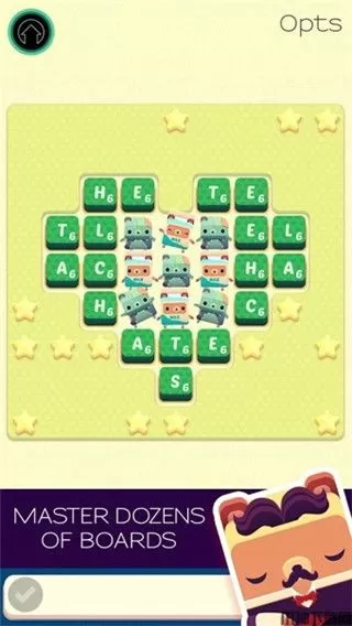 1、这是一个拼字益智闯关游戏,需要玩家将一个格子里的字母,不断拼成英文单词。
