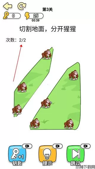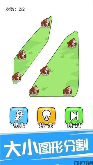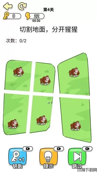 神脑洞游戏是一款创新趣味的休闲益智类游戏,在游戏中你需要使用画线的方式切割土地,分开好斗的猩猩,让它们和睦的生活。