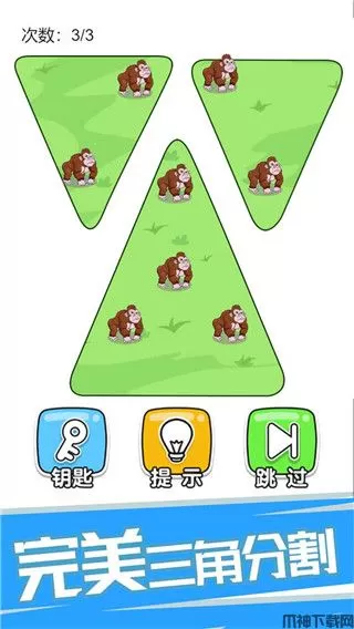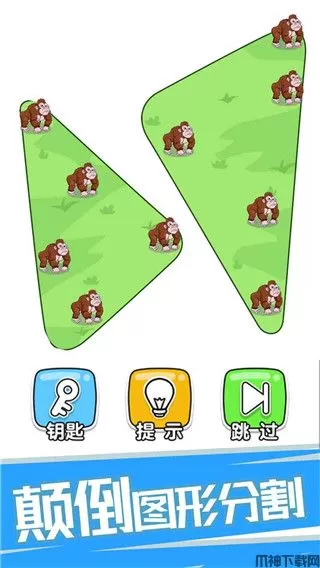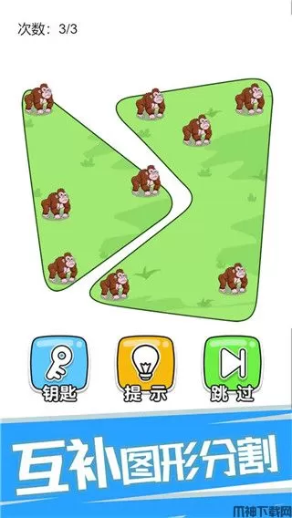 神脑洞游戏是一款创新趣味的休闲益智类游戏,在游戏中你需要使用画线的方式切割土地,分开好斗的猩猩,让它们和睦的生活。游戏整体采用卡通动画类风格,独具特色的脑洞关卡,考验思维的画线分割技巧,给玩家带来一场全新的游戏体验。游戏中的每一个地形都完全不一样,而且随着关卡的提升,难度也在不断的增加,需要你全力的发挥自己的思维才能跟得上设计师的神奇脑洞,让你惊呼脑裂、打破常规思维。此外,对于一时间想不到解决方案的玩家,它还有着全面的提示功能,帮助玩家快速掌握技巧,还在等什么呢,喜欢的小伙伴快来下载挑战吧。