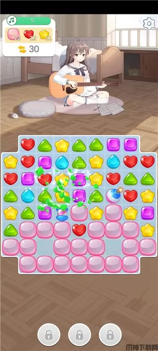 吉他少女三消官方版是一款三消手游。游戏融合了经典三消玩法,还加入了服装、弹吉他、装饰品、演奏等多种趣味性玩法在其中,你可以为人物购买装扮上各种小饰品,还可以购买各式各样的吉他,给房间布置小物件,甚至还可以维修房间里面的桌子、床。搭配上休闲的背景音乐以及温馨的画风背景,并且游戏中玩家是可以自由切换歌曲的,这一点非常的不错的。吉他少女三消中,还为玩家们内置了大量的任务供其挑战,完成任务即可获得丰厚的奖励,以此解锁获得更多的服装、装饰品、吉他,从而点亮你的收藏图标和套装。