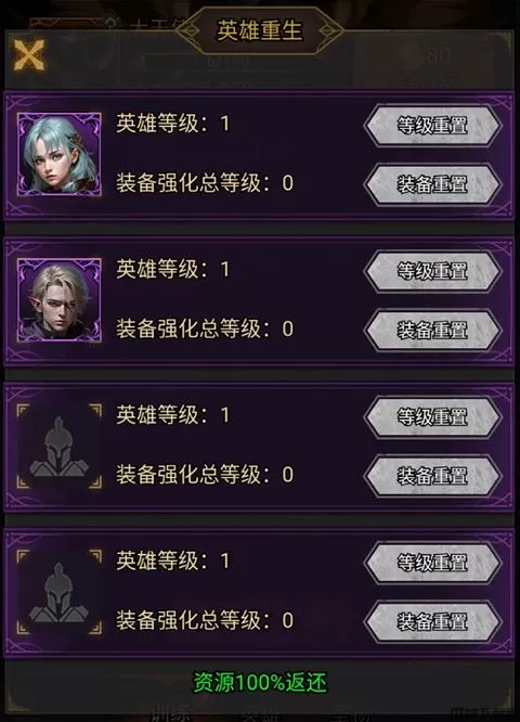 6、如果玩家对不想对已经升级的英雄继续升级,可以对英雄进行重置,返还已升级的资源。