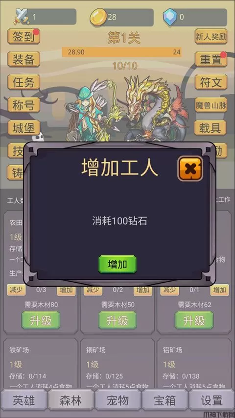 一般晚上睡觉,只用给农田和伐木场工人,这样早上起来,农田和伐木场满了,就可以放心的用食物去生产其他材料。钻石锻造屋铸造获取的钻石=森林里面的钻石屋生产的钻石×城堡里钻石锻造屋的等级,现在性价比不高,还是优先升农田。