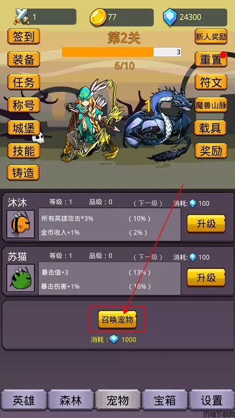 宠物需要花费200钻石才能捕捉,玩家开局签到可以获得丰富的钻石,可以把所有宠物解锁,总共12个,然后第一天将带暴击值的都点满,后面就优先点暴击伤害+所有英雄攻击的宠物(狂暴蜗牛、哥布鸟、黄小侠、蜗牛兽),再然后就是加英雄攻击的宠物,每天看完广告就提升宠物,可以留一点钻石学技能