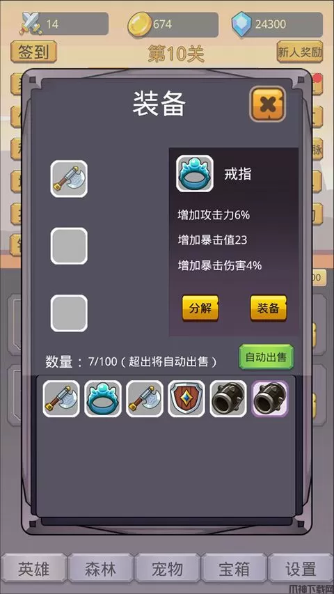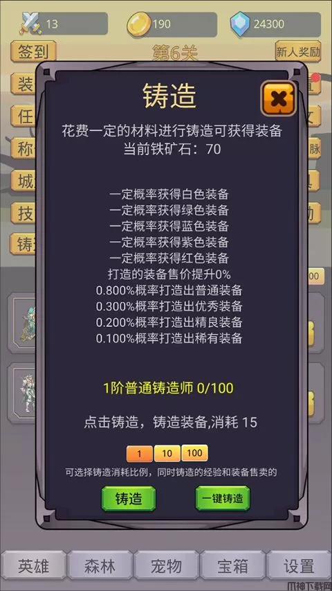 玩家可以通过铸造来获取装备,消耗铁矿石即可铸造,每次铸造需要消耗15铁矿石,铁矿石通过推关就可以获得。