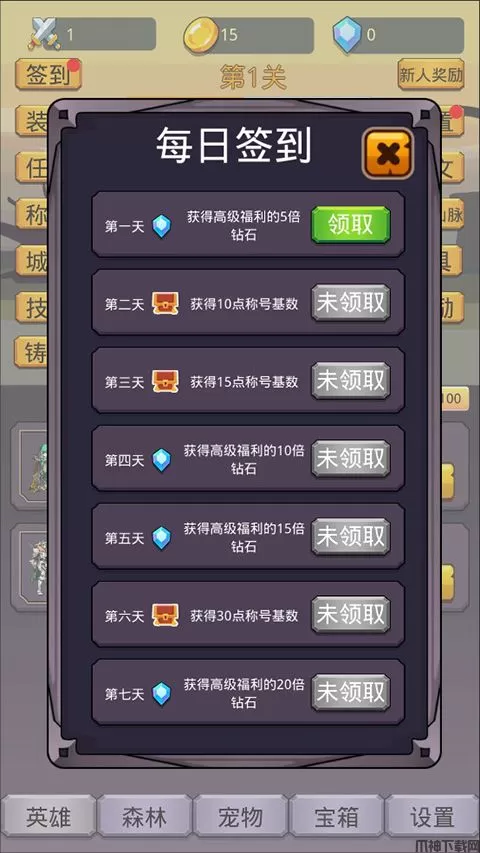 开局可以先签到,弄个1阶稀有装备,刷出属性在7000%攻击以上就够用了,然后推关到24关,重置1关,重置两次,获得400符文,把符文点满,或者去看广告,看完20个高级宝箱,再去签到,每天任务必须做满,很重要。