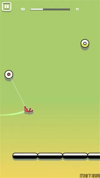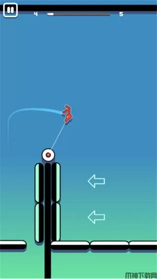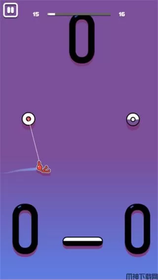 2、火柴人会自动跳跃起来,这时候主要点击屏幕,火柴人就会与支点连接起来,通过各种角度,把自己荡出去。