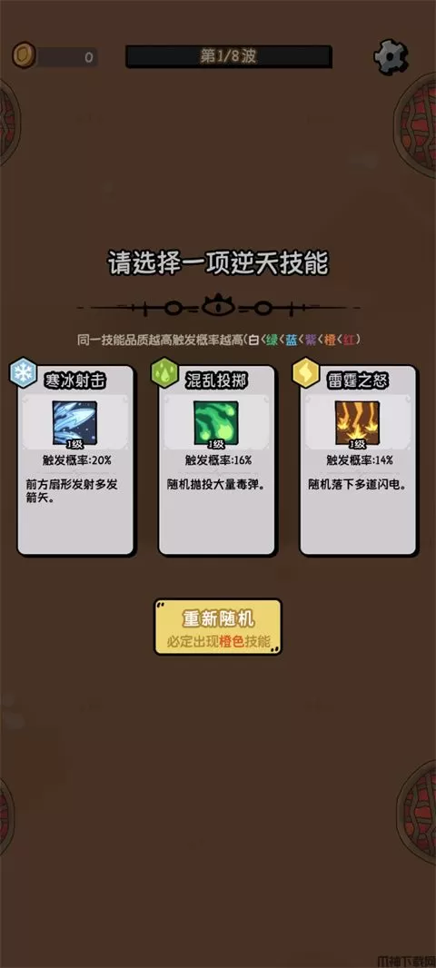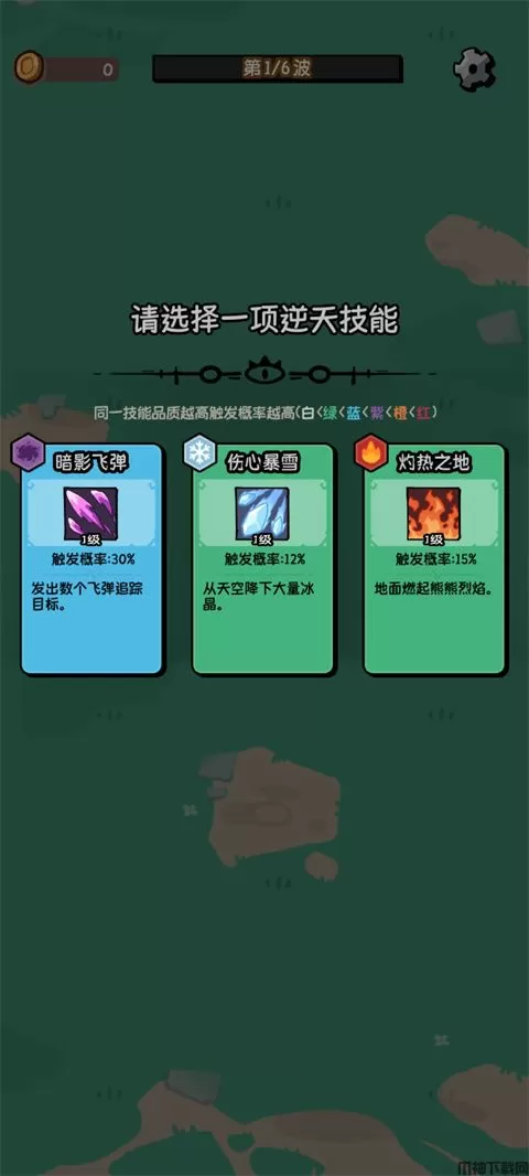 5、每消灭一波怪物即可从三个随机技能中选择一个;