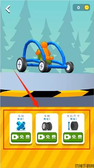 1、下载并打开游戏,进入游戏点击车间,将车架、车轮、车胎尺寸进行升级,提升车的性能。