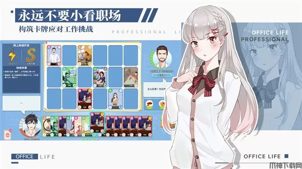 游戏融合了卡牌构筑式玩法,玩家能够选择“上班”、“加班”、“摸鱼”等多种卡牌流派套路,来解决职场中各式各样的工作挑战。在无数的职场与生活事件中做出抉择,获取能力卡牌扩充你的牌组。